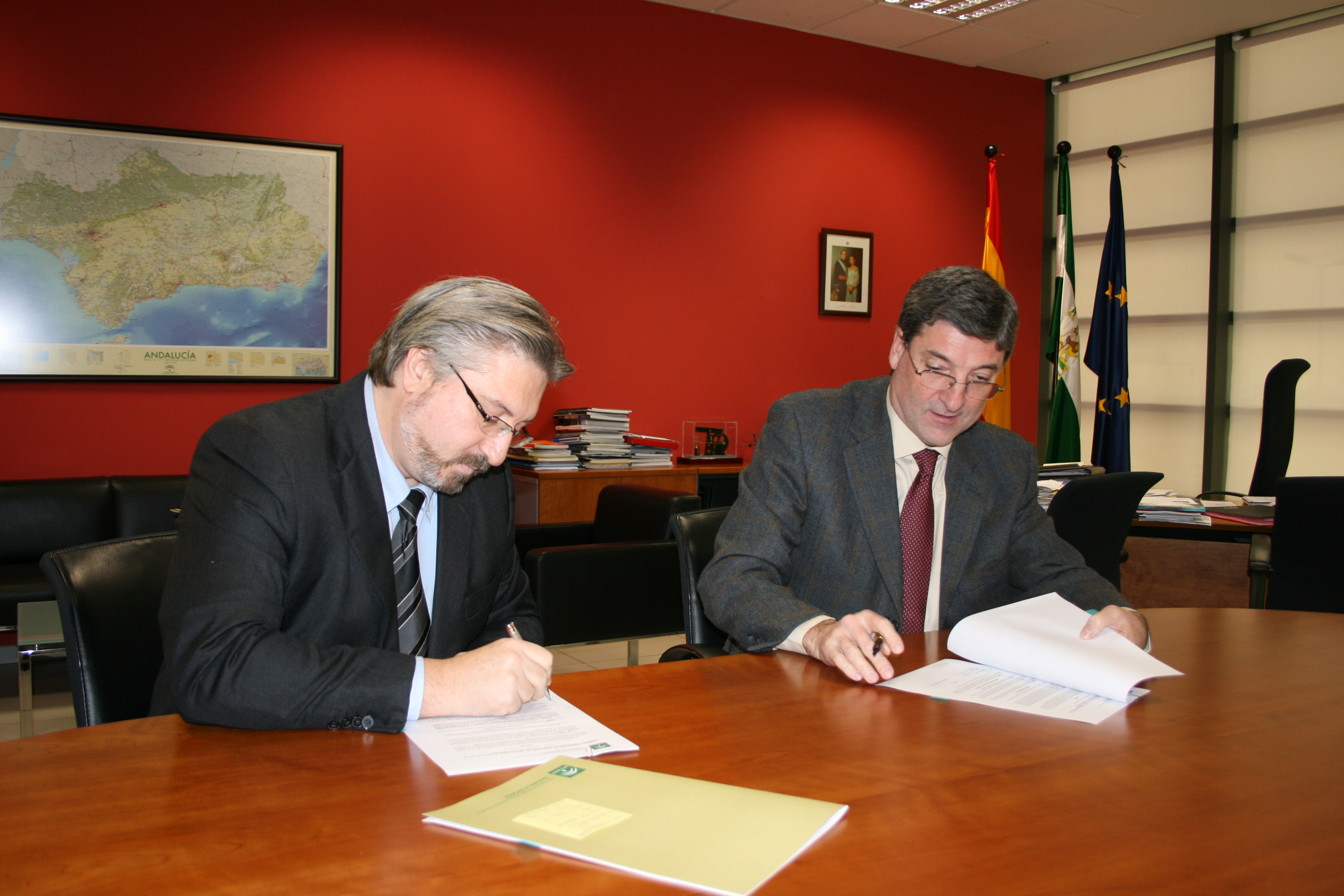 En la imagen, firma del contrato para la ampliación del IES Turaniana entre Miguel Ángel Serrano, director general de ISE Andalucía, y Alejandro Daza, de Construcciones Velázquez de Castro (03.02.2010).